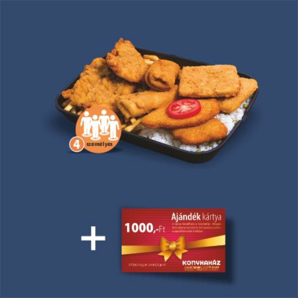 Rántott sertéskarajok, rántott sajtok, rántott csirkemellek, sonkával és sajttal töltött rántott palacsinták hasábburgonyával és rizzsel